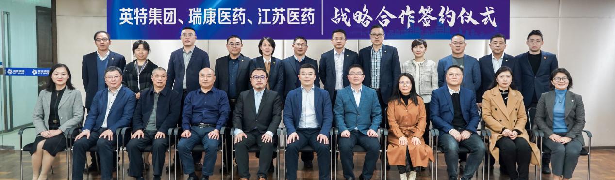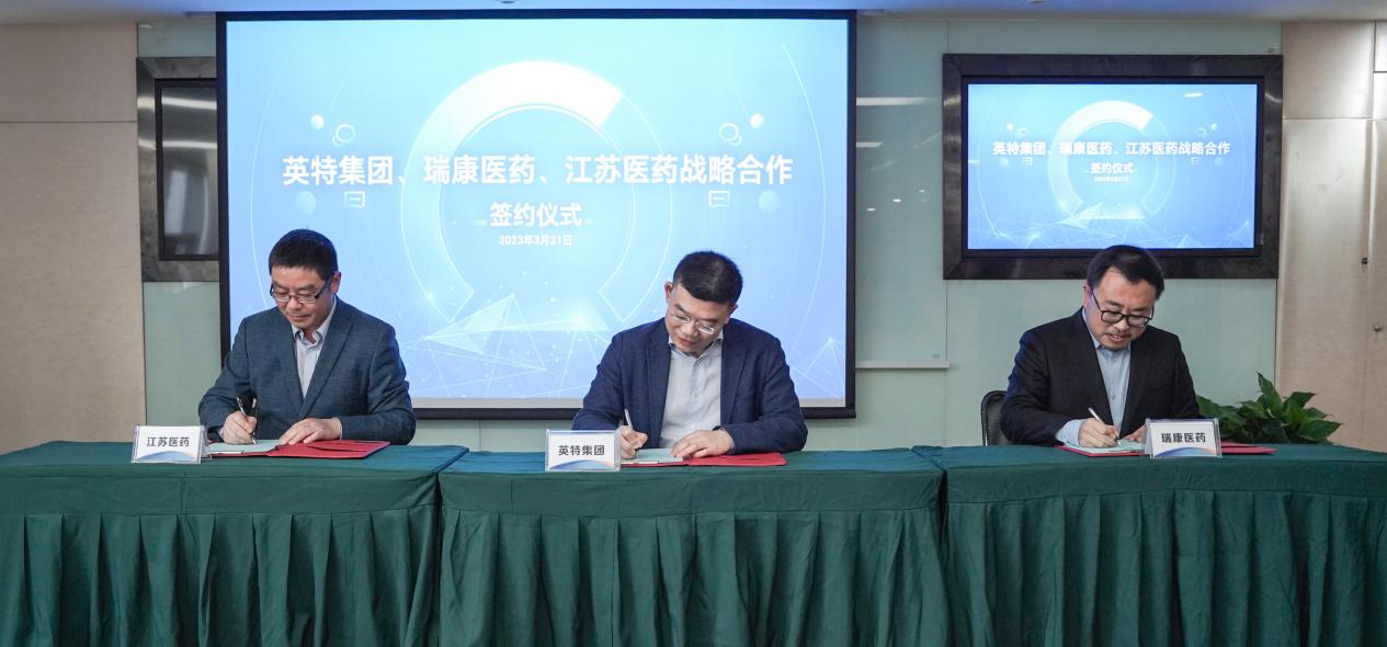 簽約儀式上,英特集團董事長應徐頡、瑞康醫(yī)藥副總經(jīng)理楊博、江蘇醫(yī)藥總經(jīng)理陳冬寧分別代表各方簽署戰(zhàn)略合作協(xié)議。
